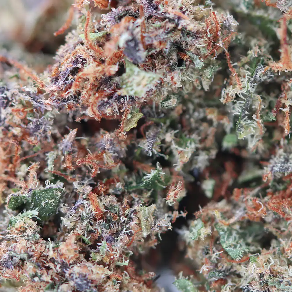Een dichte, compacte structuur met volumineuze, goed gevormde toppen die bedekt zijn met een dun laagje hars waardoor ze er licht berijpt uitzien. De oranjekleurige stampers contrasteren met het geheel.